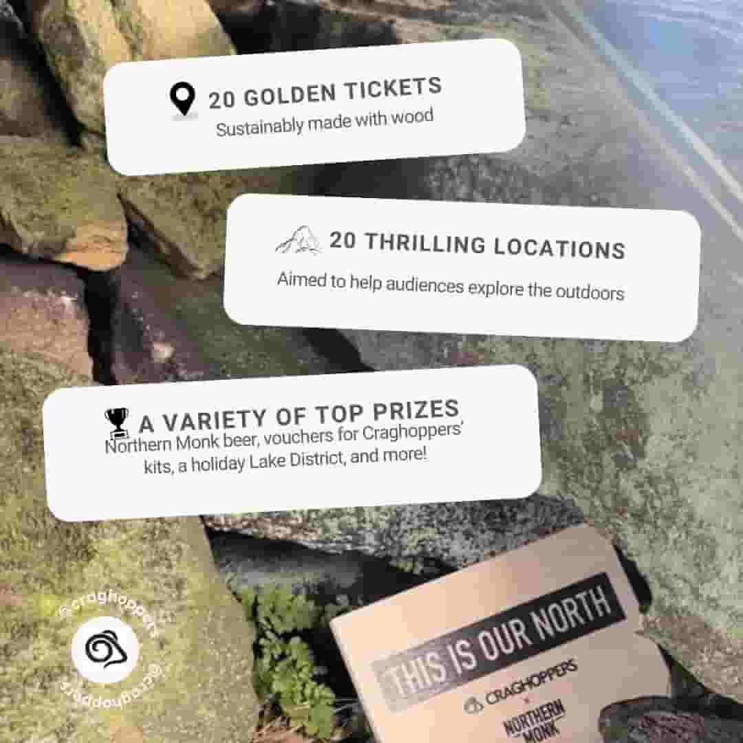 Based on all of this, the team came up with their “This Is Our North” influencer marketing campaign: 20 hidden golden tickets, 20 thrilling outdoor locations, and a variety of fun prizes to be won, including bespoke cans of Northern Monk beer, vouchers for Craghoppers’ kits, and a holiday Lake District, a popular mountainous national park in North West England.