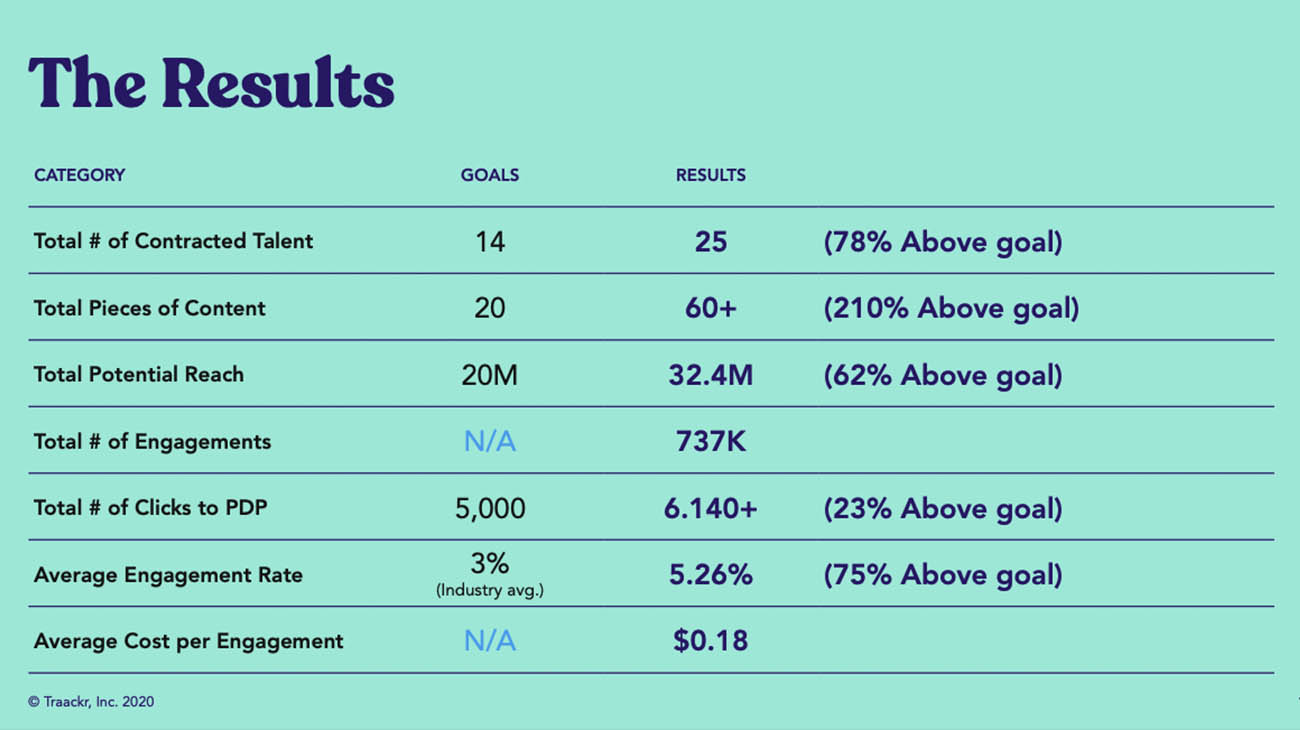 - Traackr’s platform enabled Revlon to search outside their standard parameters to find niche content creators for this specific campaign