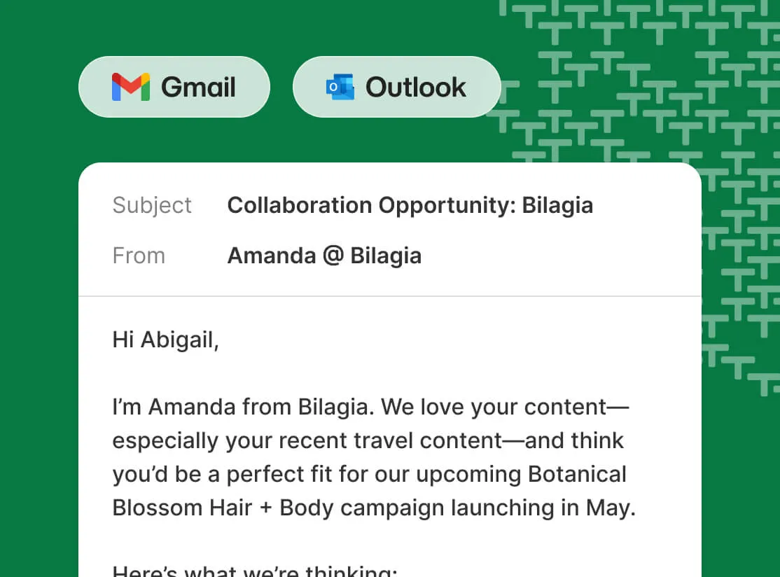 Send personalized emails to your creators, individually and in bulk, and automatically track ongoing conversations for visibility across your team.