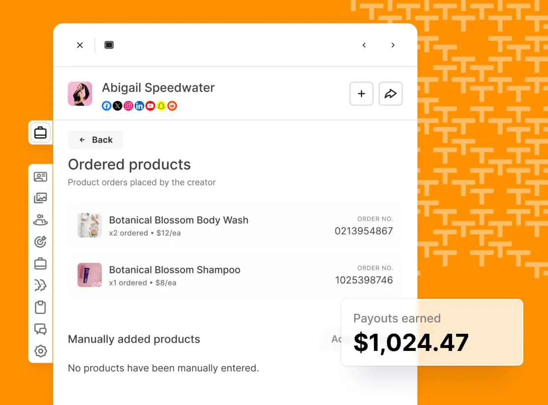 Automate product seeding and fulfillment by letting creators order their preferred products in Traackr or directly in your Shopify store. Capture their product preferences and generated content to track the performance of gifting investments and improve impact over time.