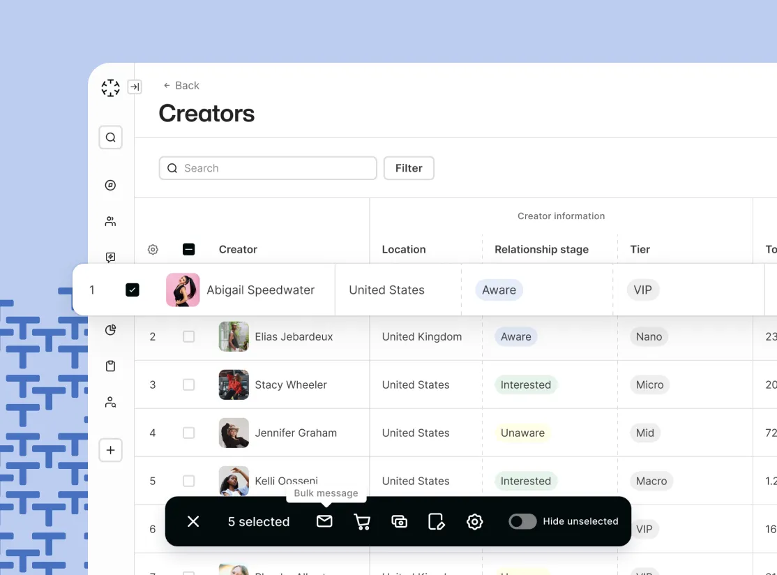 - Organize your network and activate creators with automated segmentation and bulk actions.